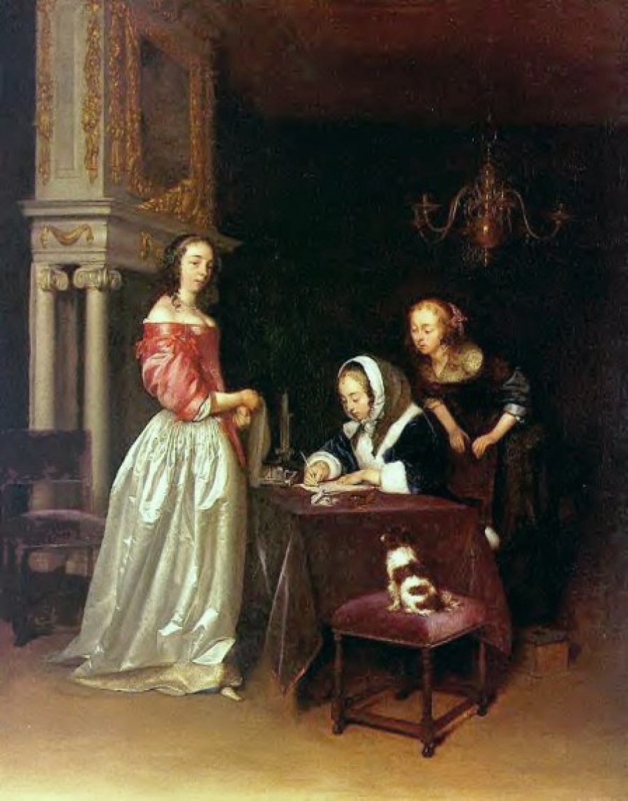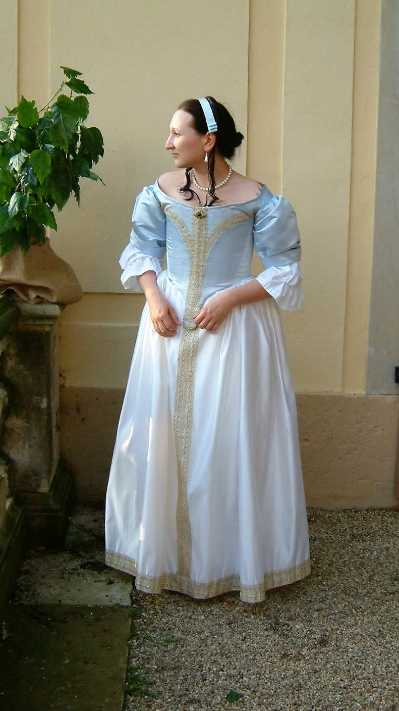 Pattern for an elegant gown fashionable c. 1660. Our pattern is based on extant period garments and paintings by ter Borch, Vermeer and others.