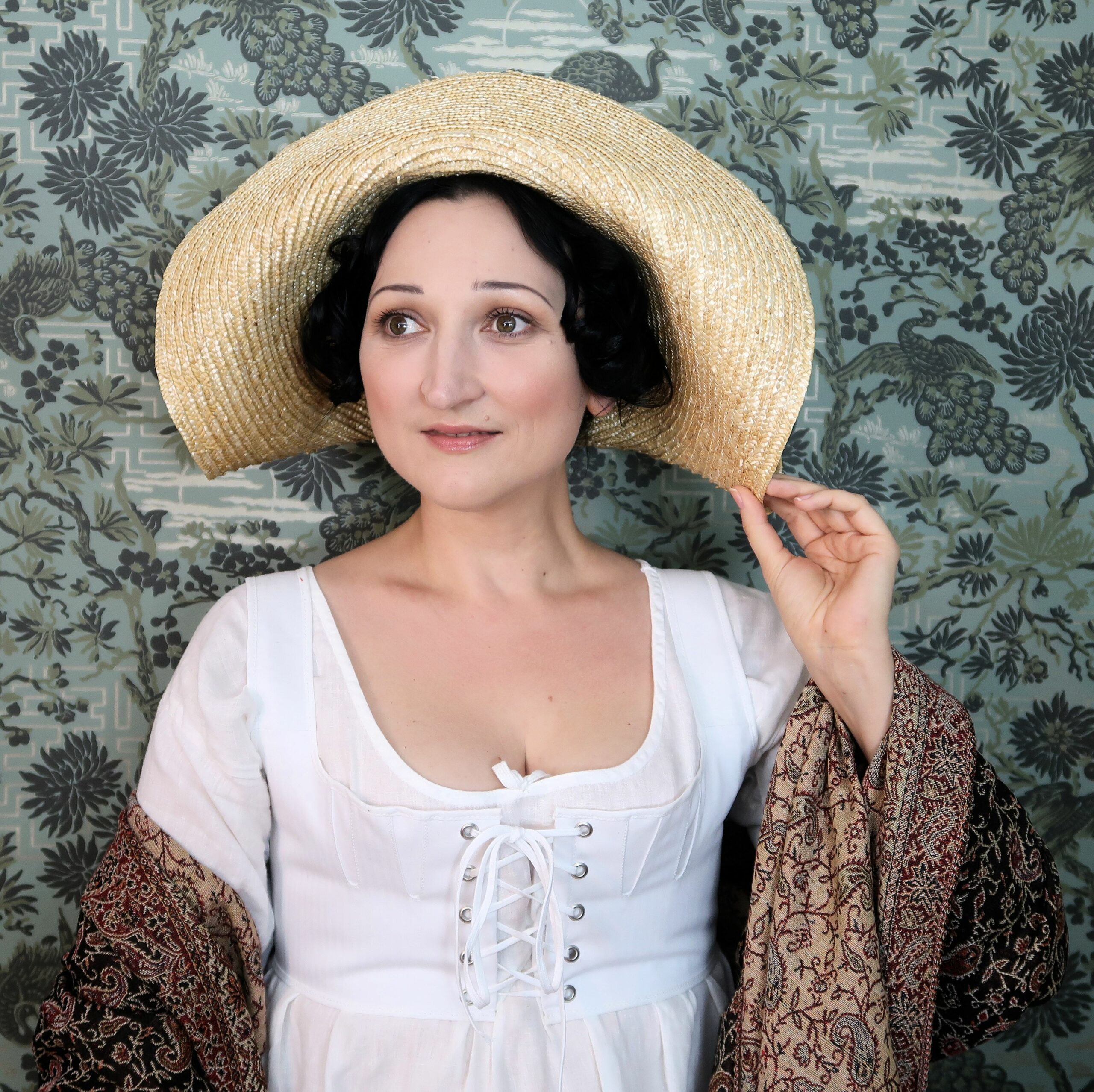 This beautiful style made from natural wheat straw is a versatile companion through the centuries. Depending on how you trim it, it’ll accompany you from the 1790s – 1930s! Think flowing regency dresses, romantic edwardian outfits or playful 1920s styles. There are so much possibilities! The last photo pictures the hat garnished with ribbons and feathers – a romantic showstopper!