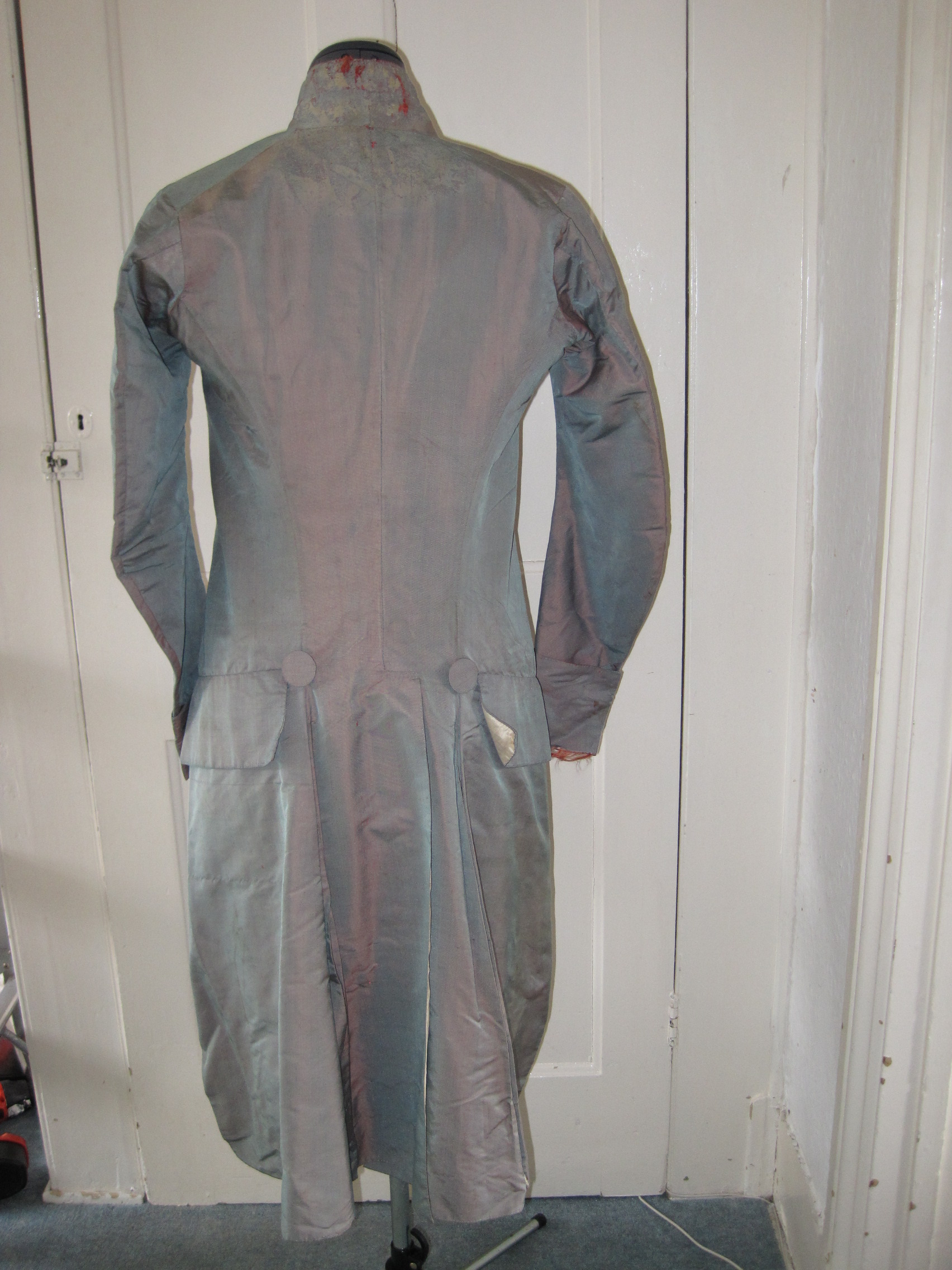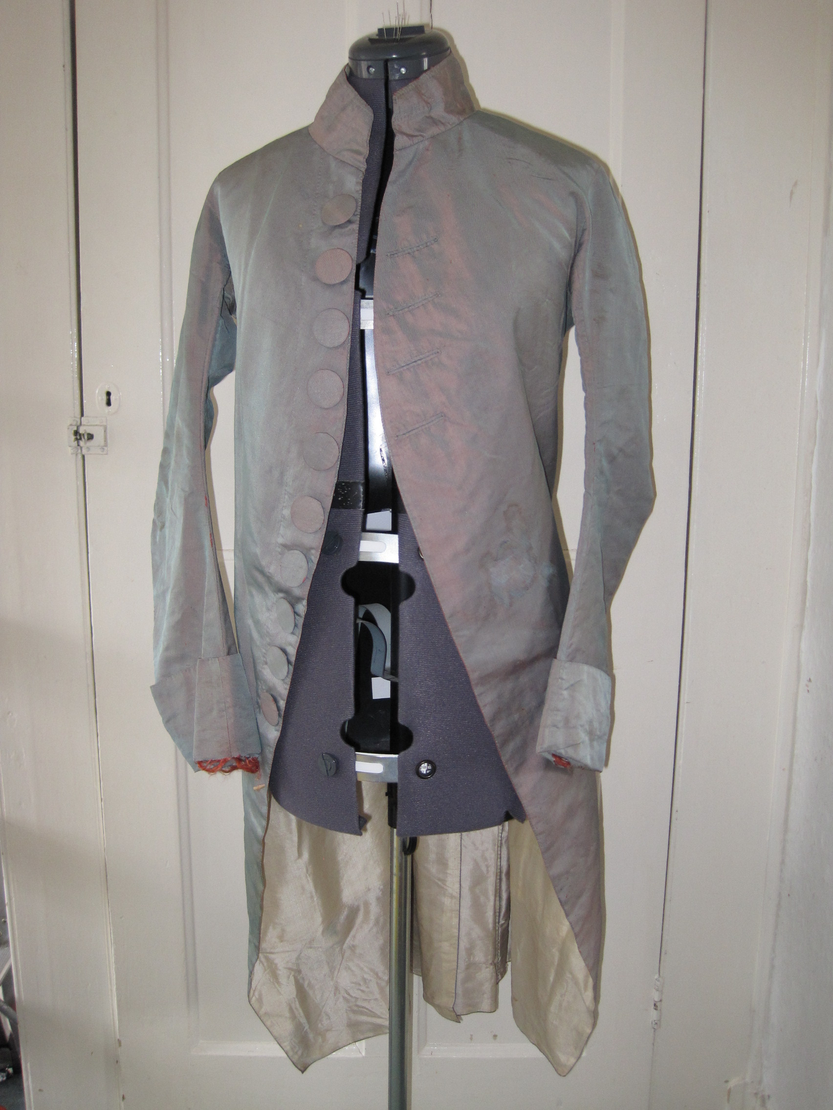 Louis-Léopold Boilly, Robespierre (before 1794). Robespierre is wearing a very similar frock coat made from shot silk taffeta in blue and reddish tones. It is of tight fit and features large decorative buttons.