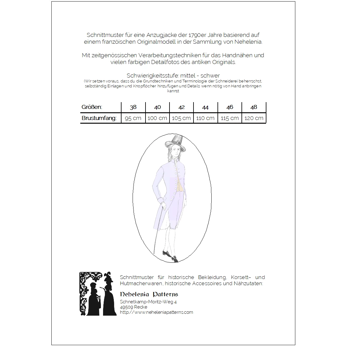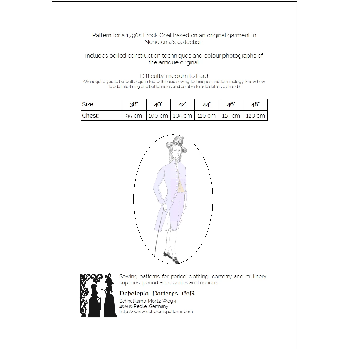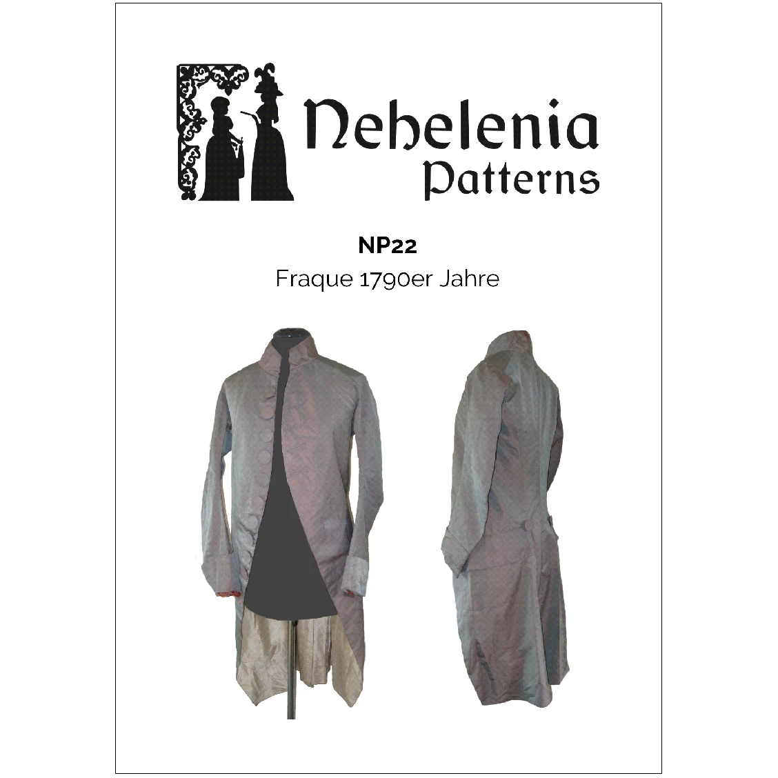 Authentic sewing pattern for a late 18th century frock coat. This pattern was created from an original 1790s garment in Nehelenia’s private collection: a suit consisting of frock coat and matching breeches originating from the French Provence, which can be dated to c. 1798 through original documents obtained with the garments. The coat’s style is typical of post revolutionary French fashion, with its small skirts, cutaway front edges barely meeting on the chest, a high stand-up collar and large fabric covered buttons.