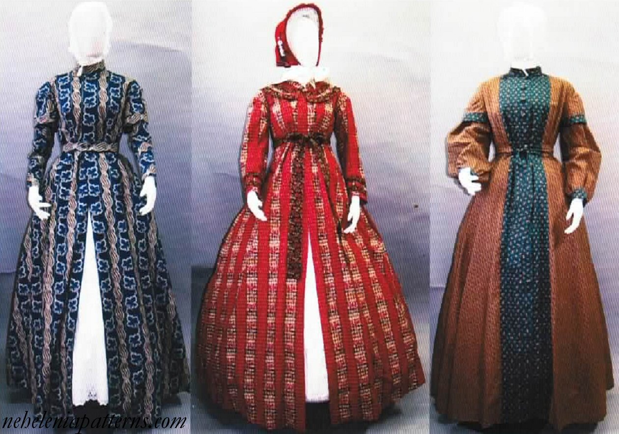 Extensive Pattern Set for 1840-1860s Adjustable Morning Dress, Wrapper and Maternity Dresses. This dress was called different things according to the style abd fashion. It is a morning dress. If left undarted and loose at the waist is is a wrapper. If darted, confined at the waist with its belt and made with finer material it is a gown suitable for a wider range of occasions. If it is made of materials that will wash, or wool and finished plain it can be called a work dress. Worn loose it can be worn for maternity.