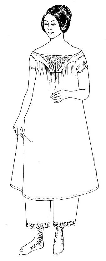 Pattern for victorian era under garment. Chemises or ‘shimmie’ were worn throughout the nineteenth century next to the body. The corset was put over this calf-lenght garment, which protected it from sweat and body odours. The pattern for this yoked chemise also contains embroidery designs to embellish it.