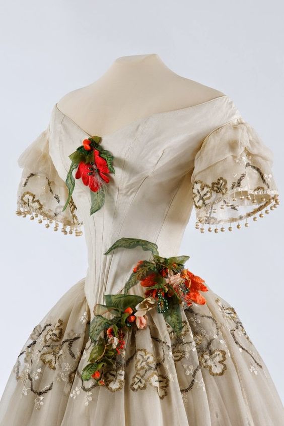 Pattern for a victorian ball gown bodice c. 1860. The princess seam construction makes this bodice easy to fit and sew. The puff sleeve with bows or the bell sleeve change the bodice from fancy to tailored. The bodice closes and fastens in the back with lace that is drawn through eyelets and is boned to fit tightly. The point may be made shorter without changing the overall look.