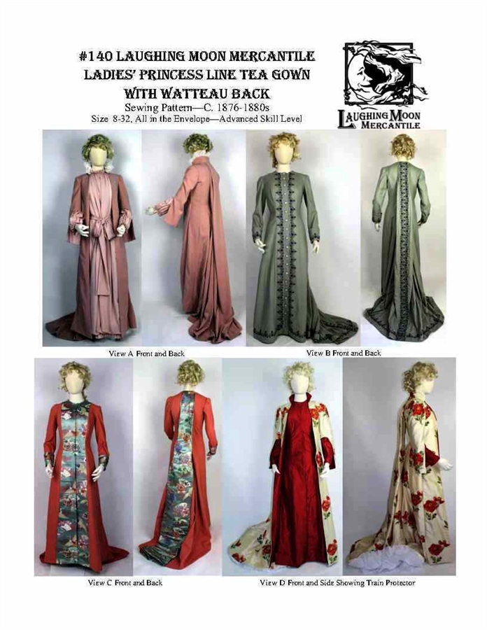 Pattern for a victorian princess line tea gown in different styles. It is suitable for fashionable afternoon and home wear. A special feature is the elegant watteau style pleated back. Style A + B are meant to look like two separate gowns worn over each other, an illusion achieved through several layers. All styles are based on extant garments and are not meant to be worn over a bustle. A corset is advisable.