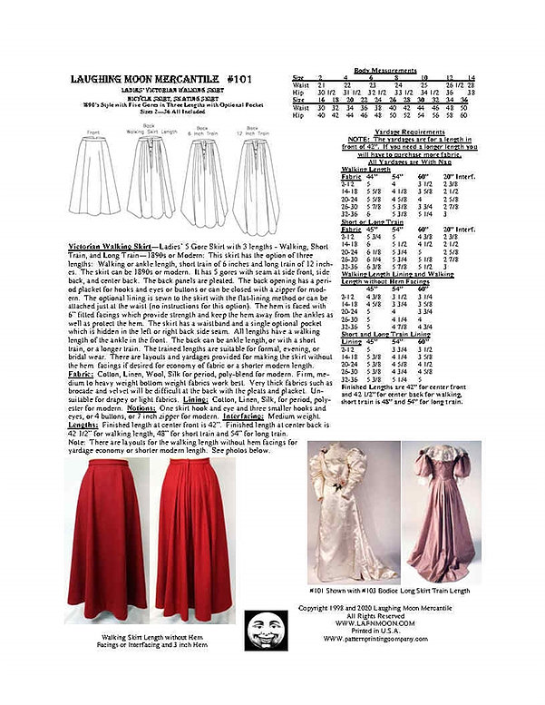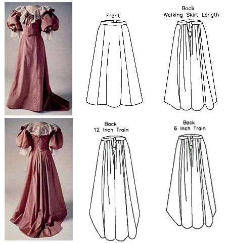 Pattern for a beautiful 1890s skirt, historically accurate, flattering and easy to make. It has seams at side front, side back, center back and pleated back panels. Back opening has period placket or modern zipper. The lining is sewn to the skirt in the flat lined method and the hems are faced. The skirt has a waistband and a single optional pocket. There are three length options, walking, short and long train. Create it in the walking skirt length for easy mobility or a stunning modern look. The short train length is great for evening, or the long train length for bridal and other formal occasions.