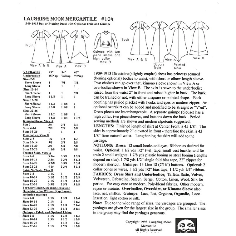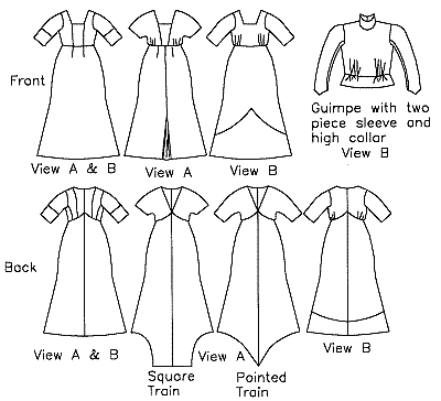 1909-1913 Directoire (slightly empire) dress has princess seamed (boning optional) bodice to waist, with short or elbow length sleeves. Two choices can go over that; kimono sleeve shown in View A or overbodice shown in View B. The skirt is sewn to the underbodice raised 2″ from the waist in front and raised higher in back. The back can be trained or not, with either a square or pointed shape. Back opening has period placket with hooks and eyes or modern zipper. An optional overskirt can be added and modified to be straight or “V’ed”. Dress pieces are interchangeable. A separate guimpe (blouse) has a high collar, two piece sleeves, and buttons down the back. Period sewing methods are shown and modern shortcuts suggested.
