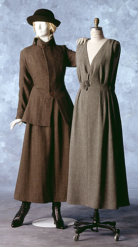 The pattern for this sophisticated World War I era outfit was made by Louis Cerlian in New York and probably a copy of a trendy Paris fashion. The military-styled Jacket features Princess seams, shaped waistline, and below-hip peplum. The high stand collar has an optional contrast overcollar; decorative insets adorn the cuffs. The Jumper has a plunging V-neck in front and back, shoulder pleats, waist-shaping tucks, and decorative buckle at center front.