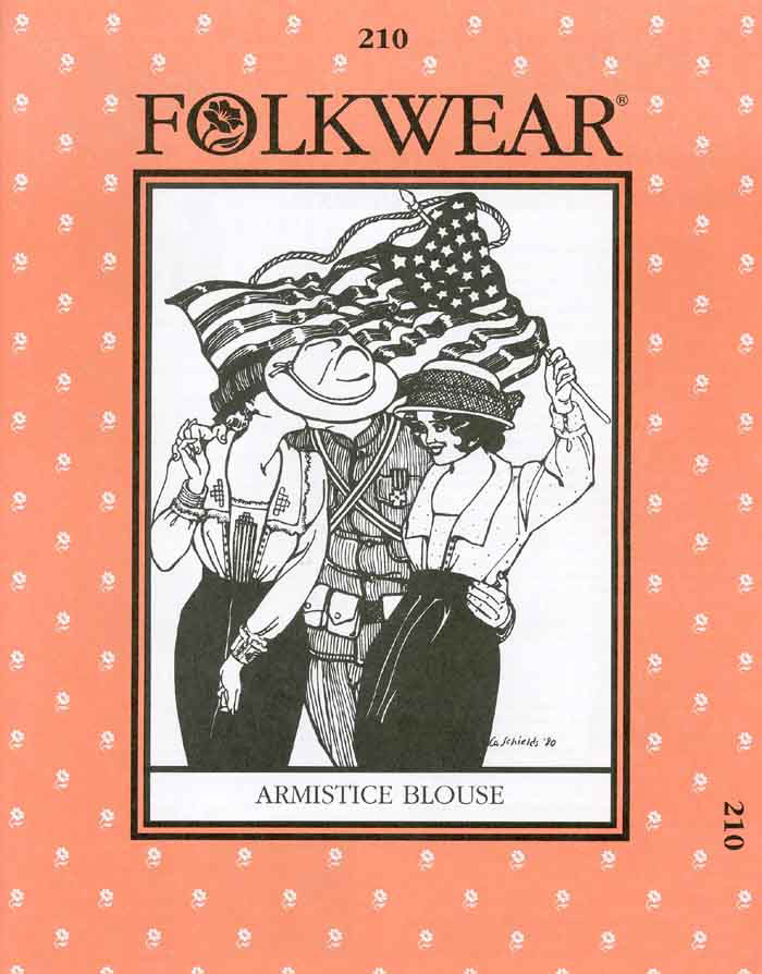 This blouse dates from 1918, at the end of World War I. Fashion was in transition from frills to practicality, and this blouse blends the two beautifully. Make it as plain or fancy as you like. The center front panel can be lacy, pintucked, or plain; the collar and cuffs can be embellished in many ways. Pattern includes instructions for drawn-thread work.