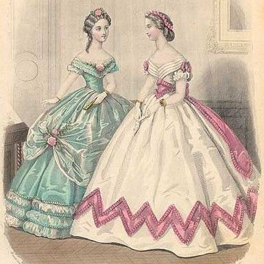 Schulterfreie Taille für Ballkleider. Der Ausschnitt wird dekoriert mit einem gerüschten sogenannten “Bertha”-Kragen und je einer Schleife an den Schultern. Vorn und hinten läuft die Bodice spitz zu. Sie wird mit einem rückwärtigem Haken- und Ösenverschluß geschlossen.