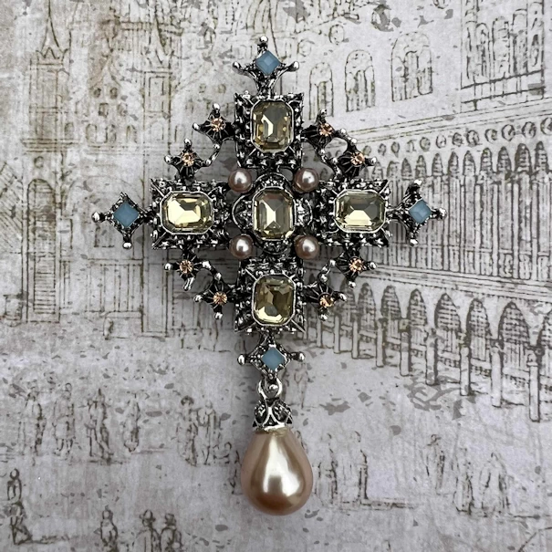 Trage diese prächtige Brosche zu deiner Barockgarderobe. Passt sowohl zu den opulenten Kleidern einer Dame als auch zu den Anzügen eines Herren. Mit zartblauen und rauchfarbenen Kristallen besetzt funkelt sie auch mit den edelsten Stoffen um die Wette.