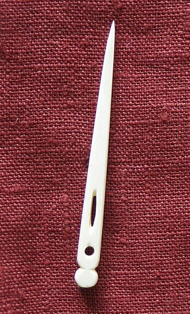 Length ca. 7 cm (2 3/4″), and about 3 mm (1/8″) wide. Dimensions may differ slightly as the bodkin is made from natural bone.