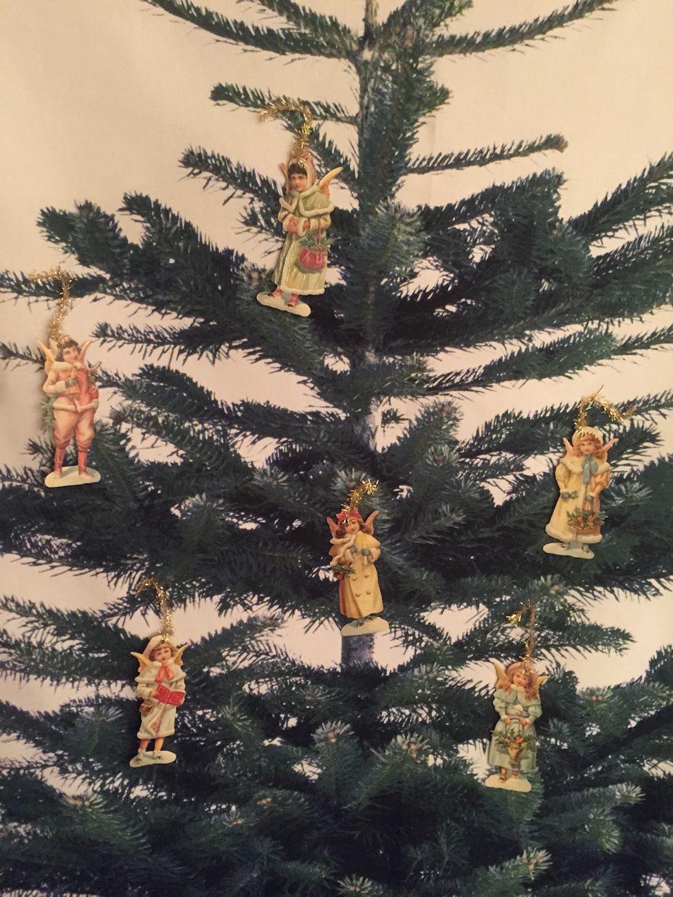 Beautiful reproductions of historical christmas ornaments! 6 angel / children motifs on golden wire, c. 11 cm large.