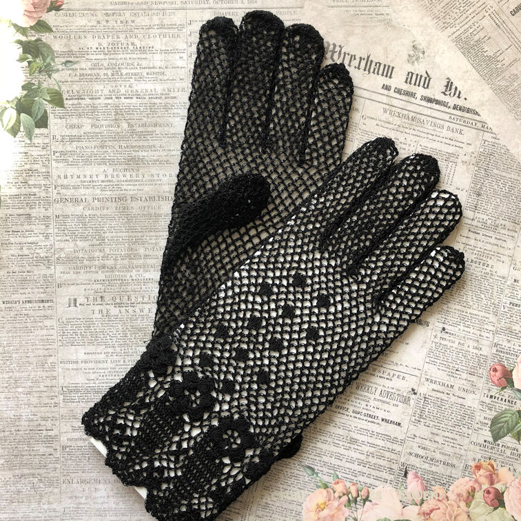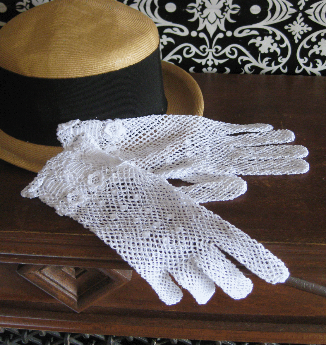 Crocheted 100 % cotton gloves reaching just above the wrist. They look dainty with your afternoon dress, a visiting or walking dress and are suitable for a variety of eras from the 19th – 20th century.