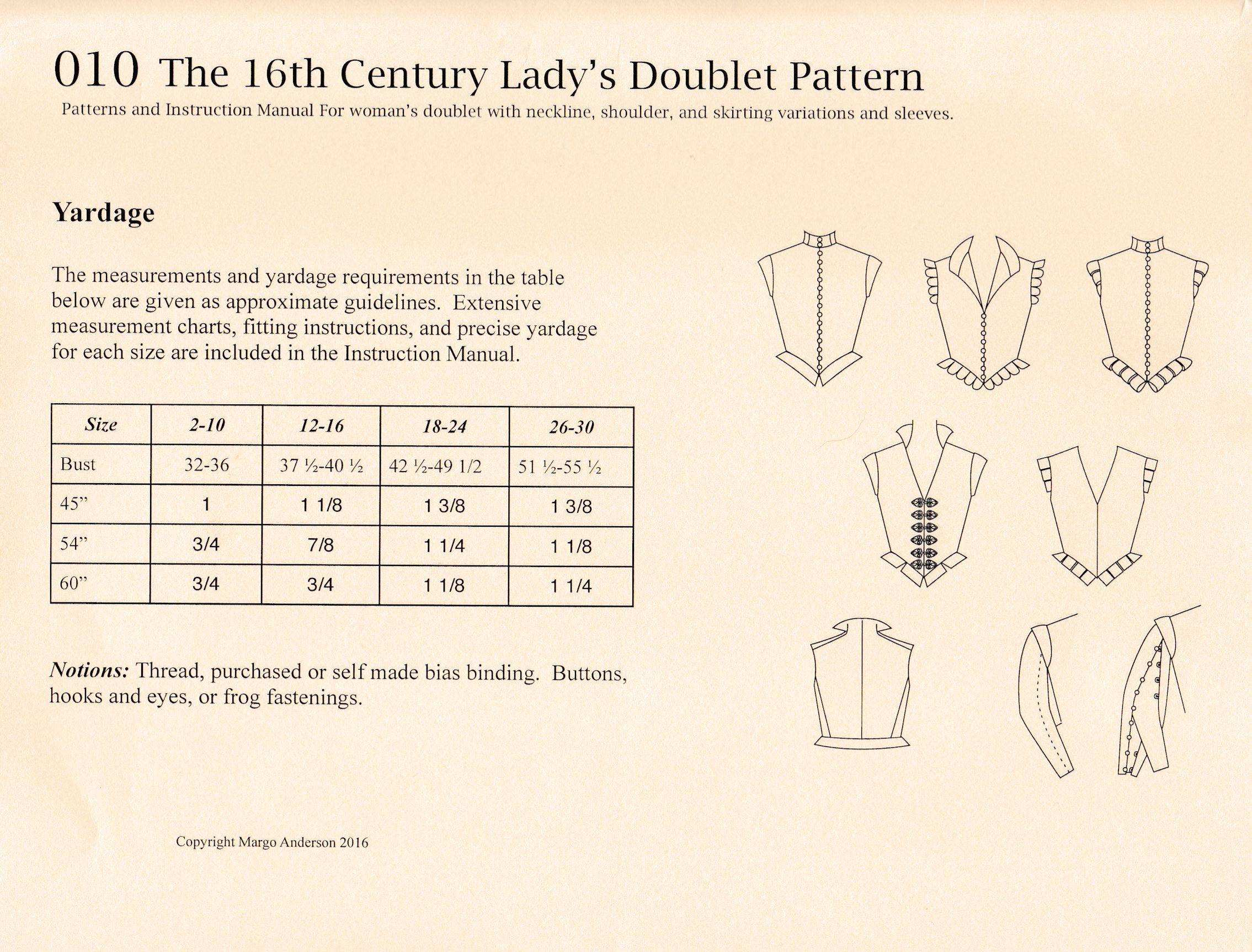 The 16th Century Lady’s Doublet is suitable for wear by all classes in the years 1565-1600. The pattern includes three neckline and collar styles, sleeves, and several skirting and shoulder treatment options.