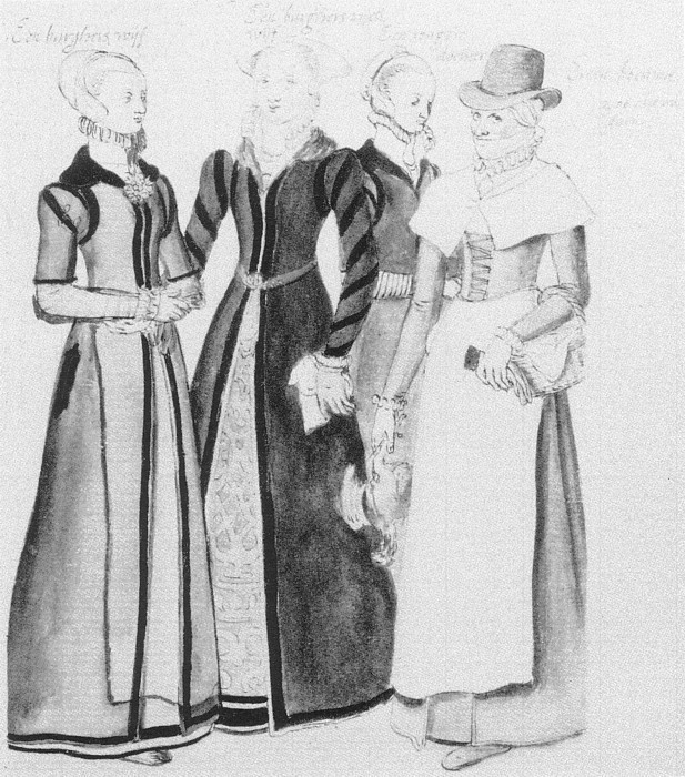 This ensemble is based on the kirtle and gown from Janet Arnold’s Patterns Of Fashion. The lines suggest that the garments were suitable for pregnancy, but the style was worn by women of all ages and classes, in varying materials.