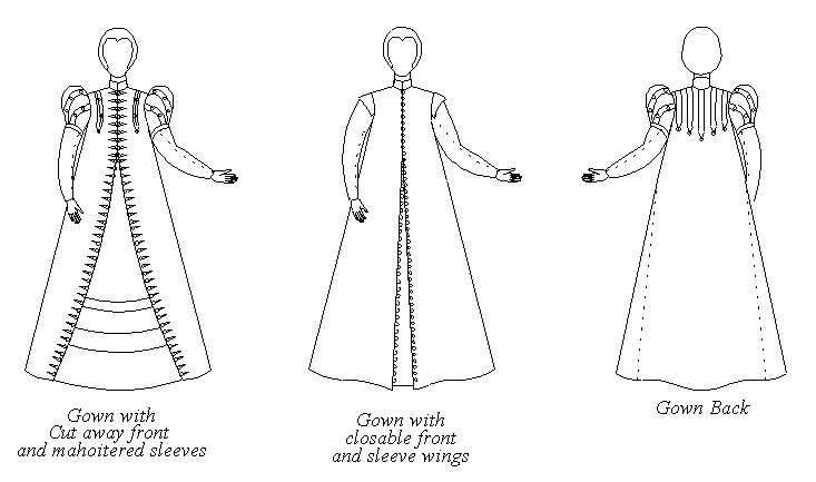 The Gown is a semi-fitted coat, with short shaped puffed “mahoitered” sleeves or shoulder wings. It can also be worn with the sleeve styles from the Elizabethan Comfort Modification pack – which generally is a great addition to this set (see below)! There are two front opening options, one cut away to show the kirtle or a forepart, the other fastening down the front to the hem. The gown may be made lined or unlined, with a wide variety of decoration.