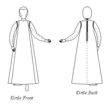 The Kirtle is an A-line, semi-fitted underdress, with detachable laced sleeves. It fastens in the back with laces, and has separate two-part curved sleeves that lace into the armholes. The hem is stiffened to support the skirts. The front panel of the kirtle can be decorated, or cut in a richer fabric than the rest of the garment. While the kirtle would properly have been worn over a smock, and often a corset, such as the ones in our Underpinnings package, it is not strictly neccesary to do so, and the pattern give suggestions on the most suitable choices of modern undergaments.