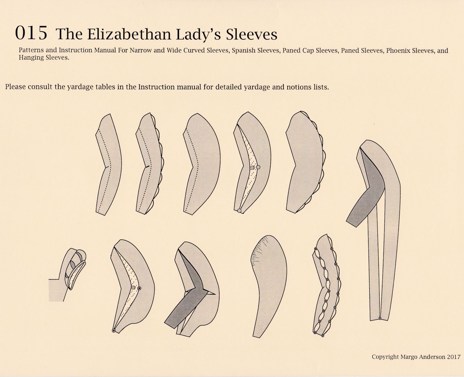 The Elizabethan Sleeves pattern includes several popular sleeve styles of the era, including: