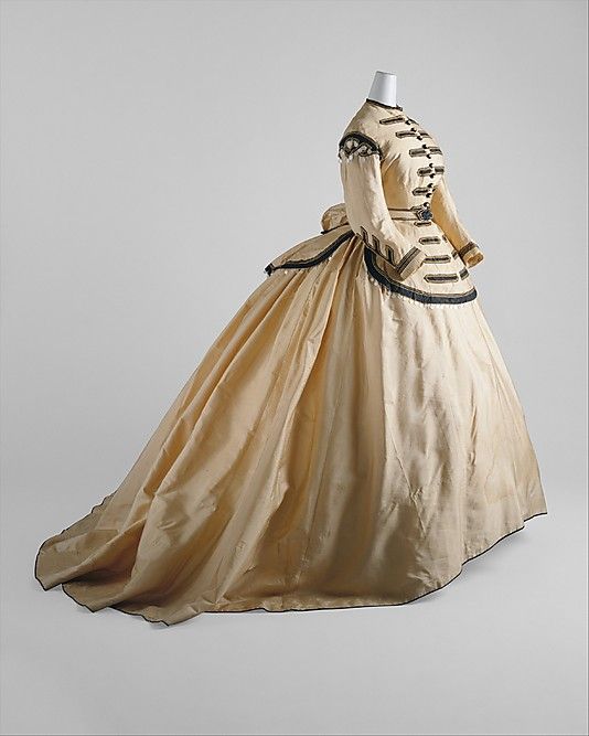 Ein typisches Rockmodell der späten Krinolinenzeit, das über einer elliptischen Krinoline getragen wird. Der weite Bahnenrock wird an jeder Naht in Falten gelegt und mit einem Taillenband eingefasst. Die ausladende Rückseite wird einige Zentimeter breit am Taillenband eingekräuselt. Der Rock hat eine wunderbare Weite von 4,62 m.
