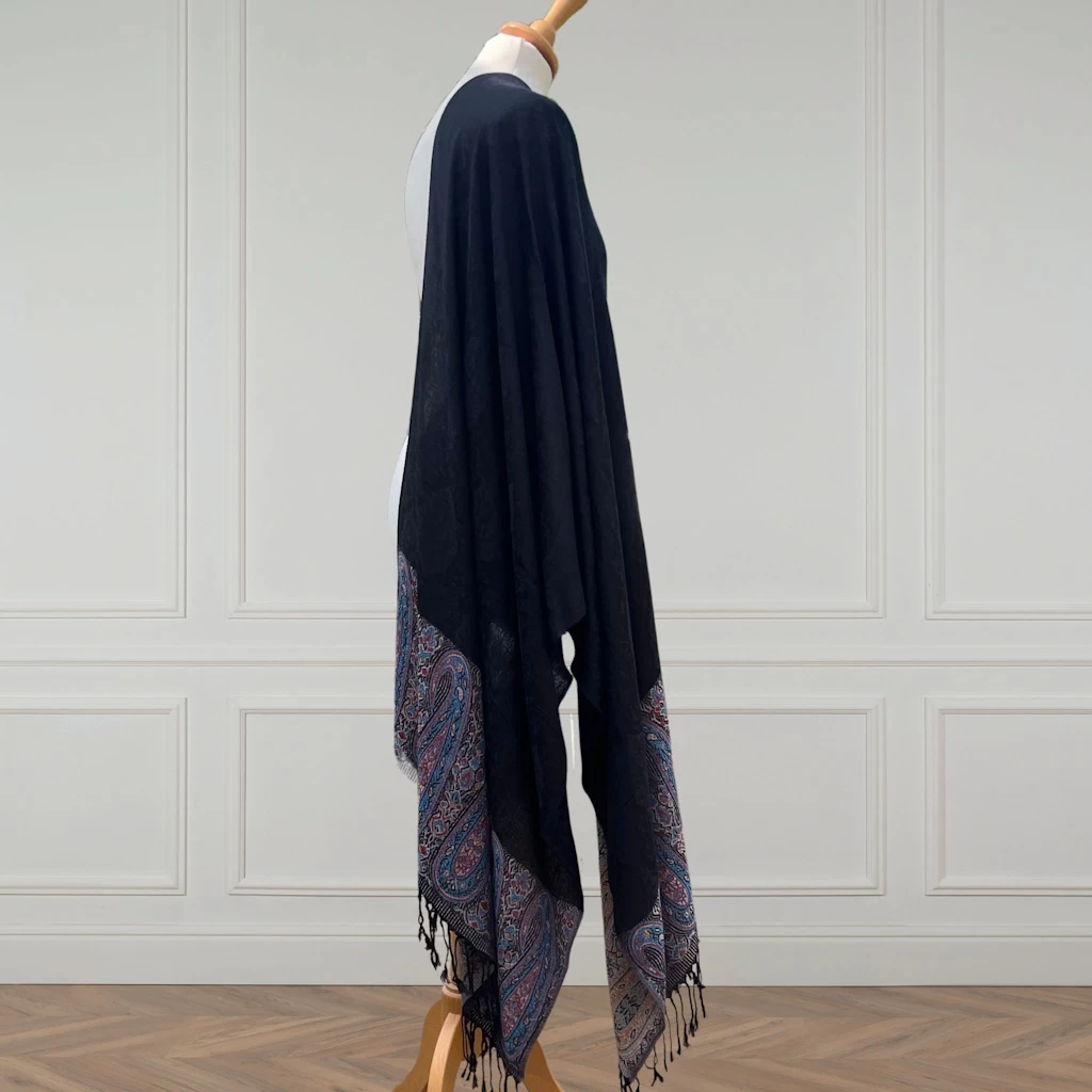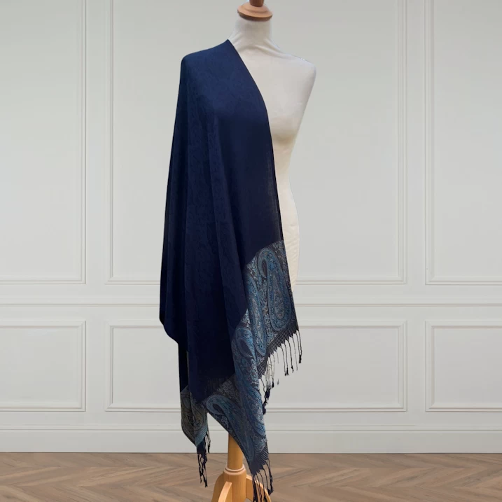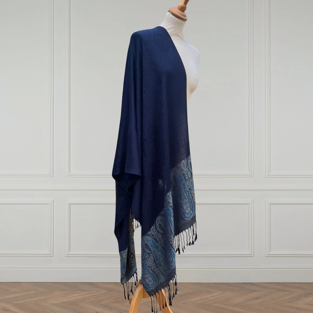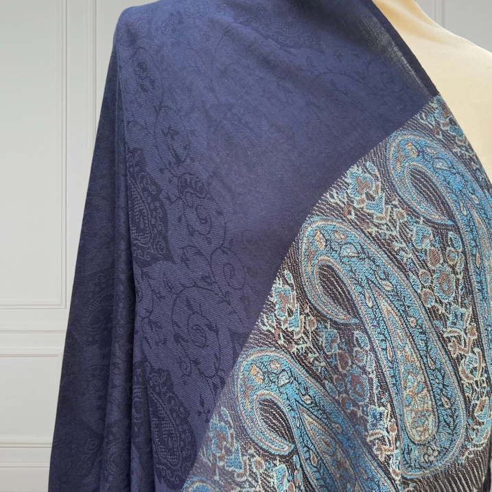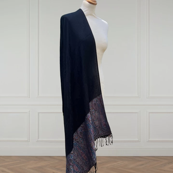 Dieses luftig leichte Modell ist ideal für die warmen Sommermonate. Das weiche, seidig glänzende Gewebe besteht aus 20% Baumwolle, 80% Viscose und ist mit klassischen Paisleymotiv versehen. Das Material trägt sich wie ein Traum und fällt sehr schön. Auch der unifarbene Teil des Schals ist gemustert – ein echter Hingucker!