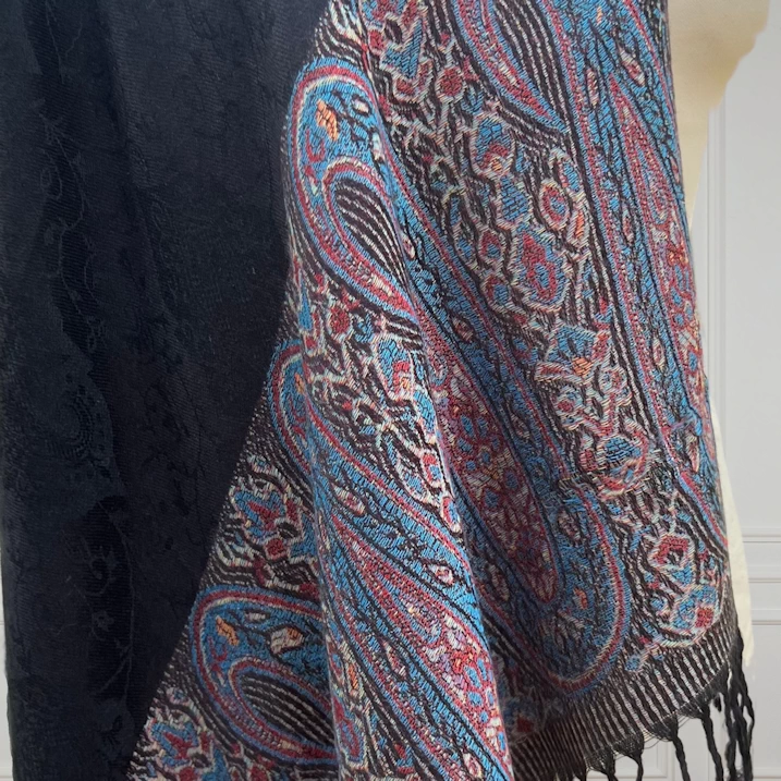 Dieser Paisleyschal ist der perfekte Begleiter zu deinem Regency-/ Biedermeier-/ Empire-Outfit! Kaschmirschals waren im frühen 19. Jahrhundert essentieller Bestandteil der Damengarderobe . Sie waren so beliebt, dass sie auch zu Kleidern weiterverarbeitet wurden, wie auf dem Bild ersichtlich ist.