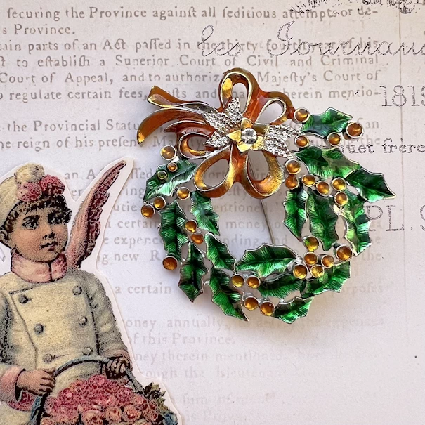 Magnificent Victorian Christmas brooch in the shape of a classic wreath with a bow. It will turn the lapel of your coat or your Christmas outfit into an eye-catcher! The model in the style of old Gablonz brooches sparkles with the Christmas season.