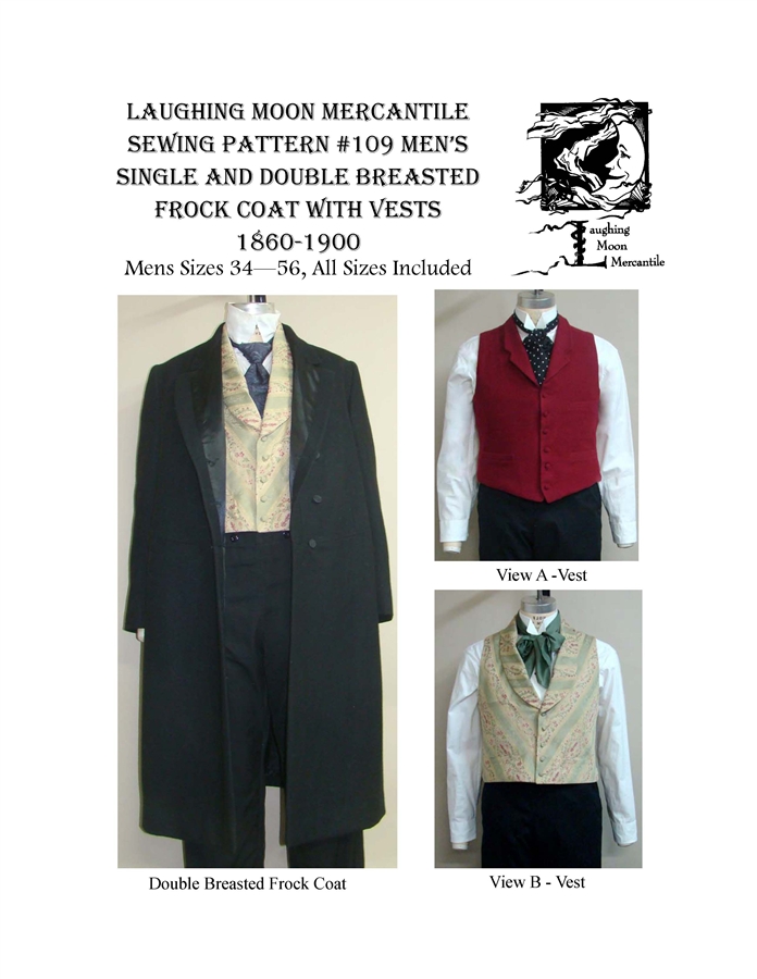 Dein Gehrock kann sowohl einreihig als auch zweireihig und mit verschiedenen Kragen- und Taschenoptionen hergestellt werden. Das Seidenfutter ist ganz zeittypisch auch an den Kragenaufschlägen sichtbar. Außerdem sind in der Packung Schnittmuster für zwei Westenmodelle enthalten. Der Zuschnitt aller Kleidungsstücke ist passend für die Zeit von 1860-1900 und geeignet für jeden Anlass!
