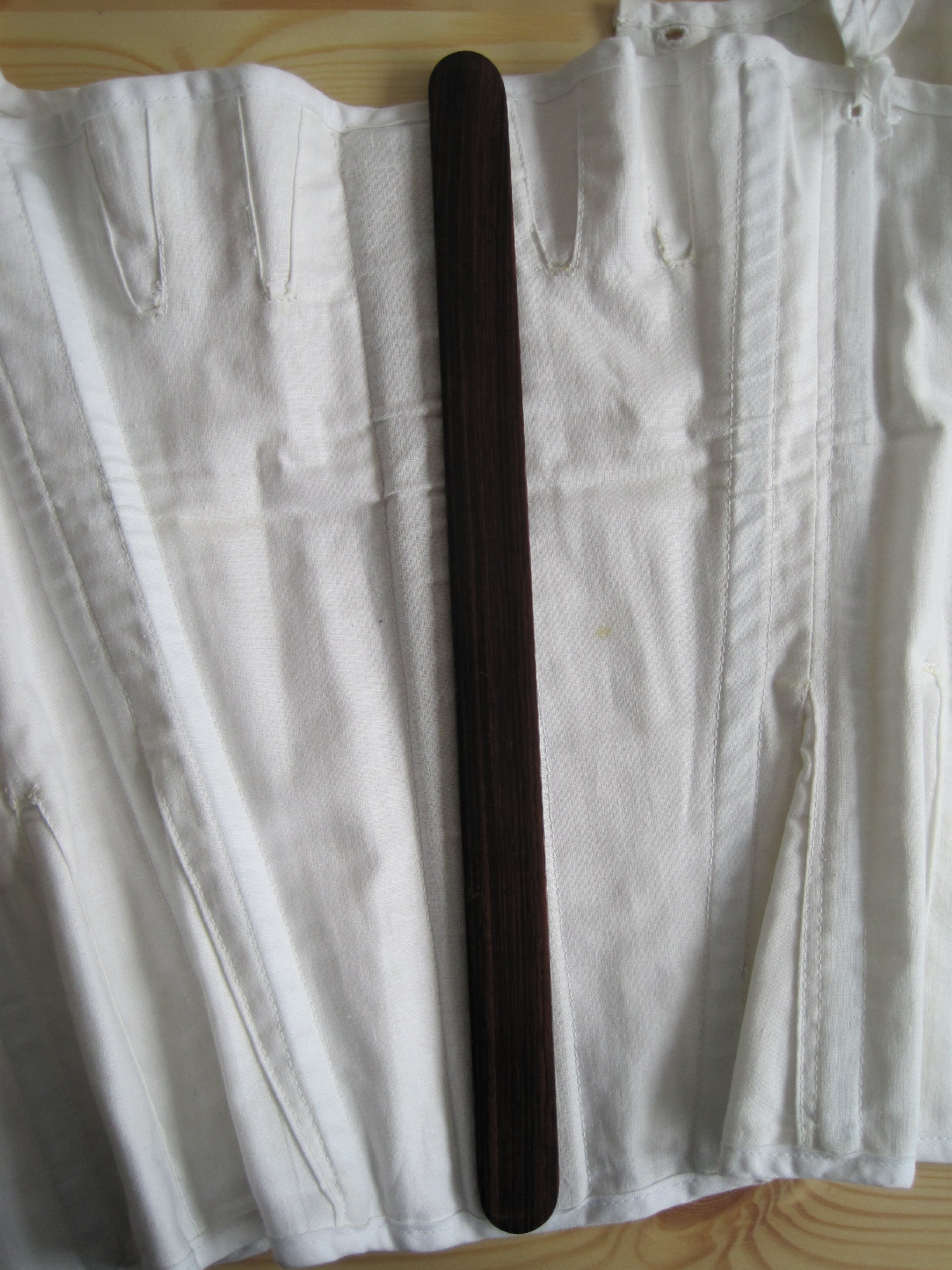 Gerades Blankscheit aus Holz. Holzplanchetten wie diese wurden zwischen dem 15. und 19. Jahrhundert in Taschen an der Vorderseite von Korsetts und Miedern eingearbeitet, die nach oben offen waren, damit das Holzstäbchen wieder entnommen werden konnte. Sie wahren die Form des Korsetts und korrigieren die Haltung seiner Trägerin. Oft war das Blankscheit mit schönen Schnitzerein verziert und diente jungen Männern als besonders intimes Geschenk an die Liebste. Dieses eignet sich hervorragend zur Einarbeitung in Empire-Korsetts.