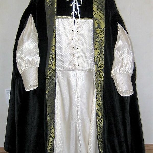 Double-breasted man’s coat with variations for collar and shoulder capes. Made from heavy wool it can be used as a protection from the elements.