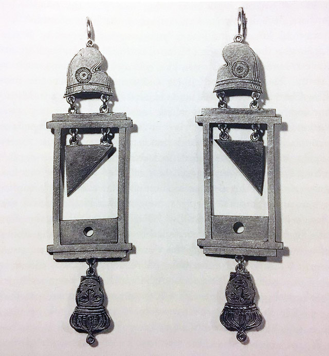 Guillotine earrings like these were a popular accessory during the reign of terror of the French Revolution (1790s), when the guillotine was seen as an instrument of liberation. They are suitable as a small provocation to your outfit of the revolutionary period.