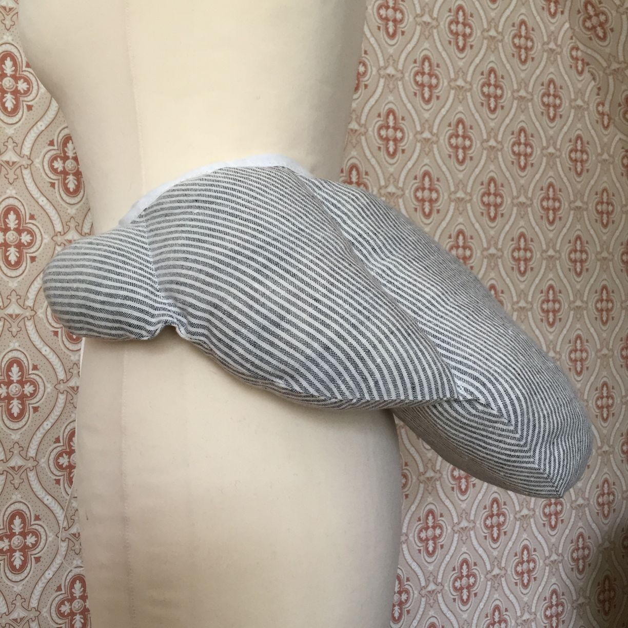 Dieses Hüftkissen passt perfekt unter Kleiderformen des späteren 18. Jahrhunderts, die ganz ohne Reifrock auskommen, aber dennoch ein wenig Unterstützung benötigen, um die zwitypische Silhouette zu erreichen. Ideal z.B. zum Levite, Round Gown, Redingote, zu Jäckchenmodellen oder zur Robe a l’Anglaise! Das Kissen verleiht Rock und Kleid Volumen ohne störend zu wirken. Ein echter „Weiberspeck“ eben, der sich zur Freude seiner Trägerin auch noch ganz leicht wieder ablegen lässt!