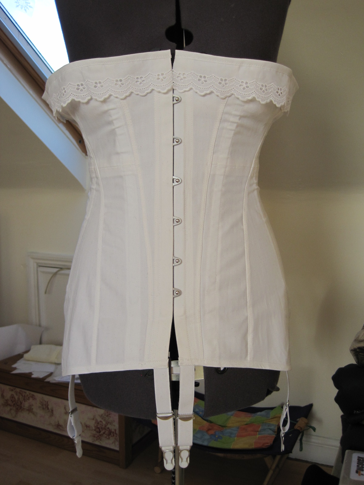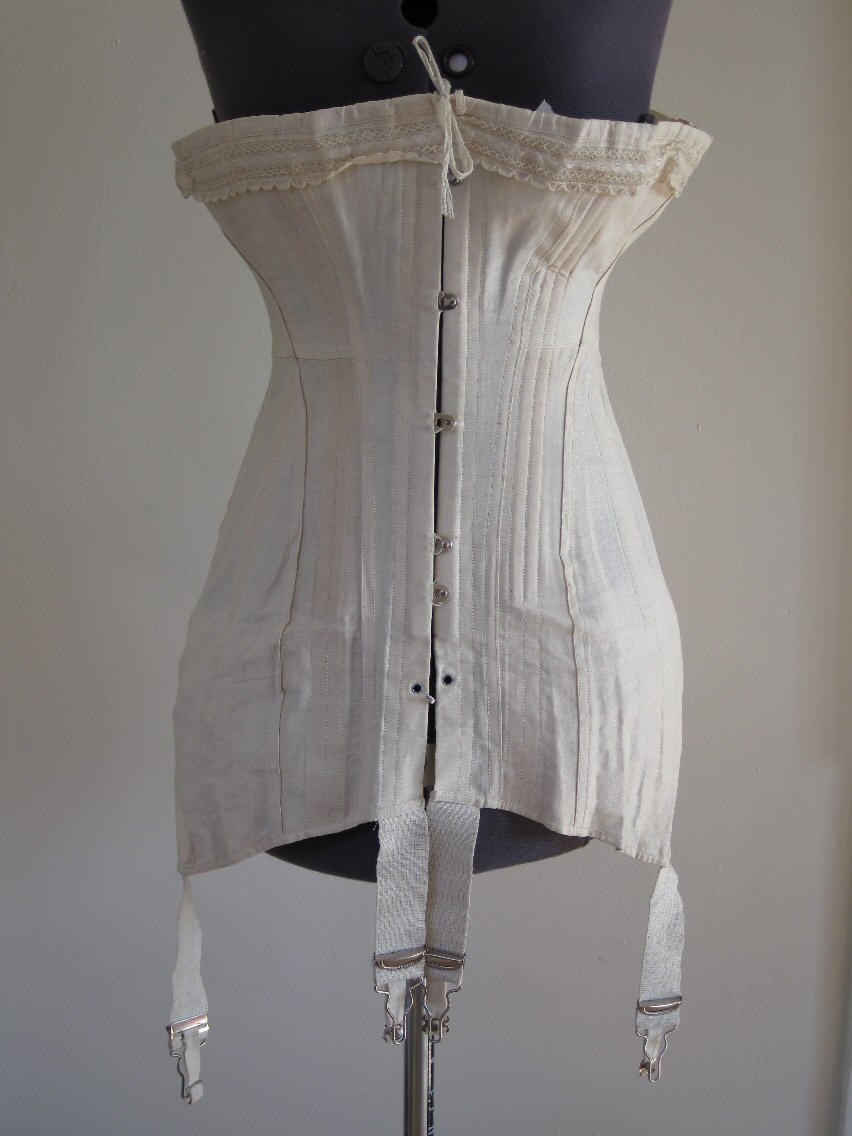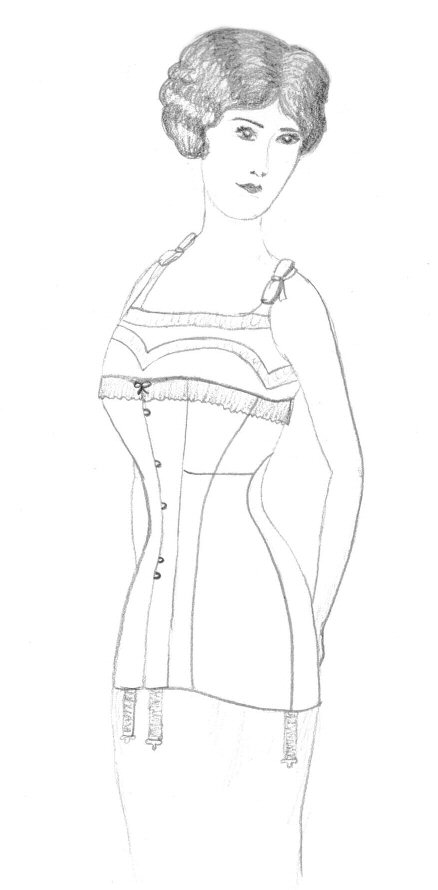 This pattern shows you how to create a 1910s longline corset, as worn by most women in the early 20th century. Our pattern was taken from an original corset in our collection. The typical teens corset is single layered, made of cotton fabric and constructed with lap seams only. The longline style was designed to give a smooth curvy silhouette under tightly fitted hobble skirts.