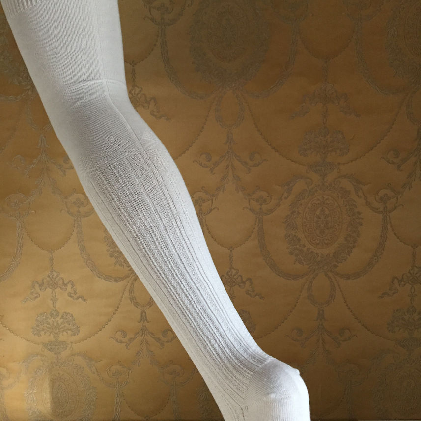 Beautiful cotton knit stockings suitable from early 19th-20th century. These have a wonderful openwork design centered on the foot and front of the leg. Based closely on extant examples, the design starts with a charming tree shape at mid-calf and continues down to the top of the toe. These also feature a simulated seam running along the back of the leg.