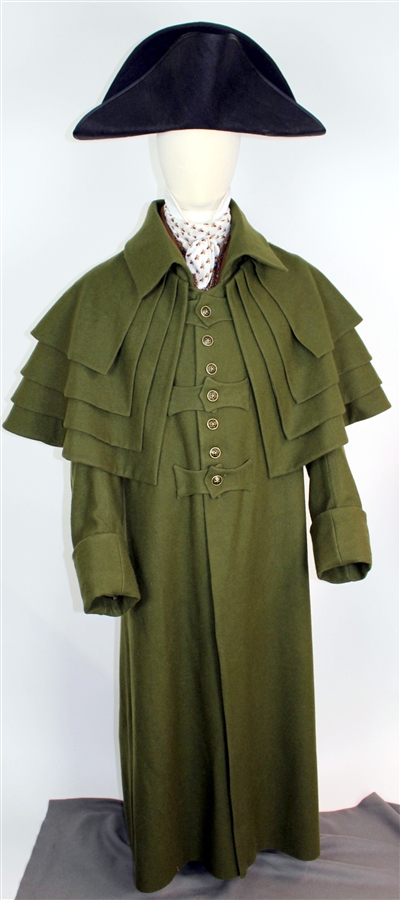 Patterns for Men’s and Ladies’ Late Georgian and Regency Greatcoat and Garrick, c. 1750- 1825. The pattern contains a Greatcoat which can be cut either single or double breasted and has the choice of a standing or a stand-and-fall collar. Any view, men’s or ladies, can have capes and the capes can be removeable. When paired with either the 3 layer cape or 4 layer cape option it is called a Carrick coat. The instructions include modern (theatrical) collar construction and period pad stitching. The coat body is the same for either the man’s or ladies’ version with only the sleeves being different. The front of the coat is plain. The back of the coat has pleats, a pocket flap, and pockets at the side backs, near the waist. The center back of the coat can be either finished with a pleat at center back waist and a back vent at the bottom, or fin-ished so that the back is open all the way from the waist to the bottom. For ladies there is an optional belt included. The sleeves are full at the sleeve heads, cut two piece, with a fully functioning large cuff that folds up at the wrist. The sleeves are long, covering part of the hand as was fashionable in the period. This overcoat is drafted to fit over the men’s garments of the period; shirt, vest, and tailcoat, so there is considerable ease drafted into the overcoat. There can be up to 10 inches of ease, depending on where you measure the body and the breadth of the coat. It is therefore recommended that a muslin be cut of the body of the coat and tried on over the garments intended to be worn under it before choosing a size and cutting your fashion cloth. The two cape options, 3 or 4 layers, both have a full cape on top and on the bottom, with the middle cape for the 3 cape option, and the middle 2 capes for the 4 cape option, being faux capes. The capes can be cut with either square or rounded front edges. Fabric: Medium weight wool flannel or wool broadcloth, well fulled. Melton may be too thick if you are using the capes. Sleeve and Cape Lining: Period– linen or cotton. Modern—any lining fabric. Interfacing: Period-medium weight linen. Modern-hair canvas. Wool Coat Lining: Period-medium weight loosely woven green wool with a high nap. Modern- Self wool, any medium weight wool, linen, silk, or modern polyester lining. Notions for Capes: An additional optional closure at the neck such as a chain hook and eye, a toggle, or a frog. 1 yard matching single fold bias tape. Buttons: Single breasted 11 5/8 or 3/4 inch, Double Breasted 16 5/8 or 3/4 inch. If using tab closures you will need the amount of buttons per number of tabs plus 4 for the back. Ladies will perhaps need different amount of buttons depending on the style of closure and if they want a belt. Period buttons should be covered with self fabric or made of metal, bone, or other period materials.