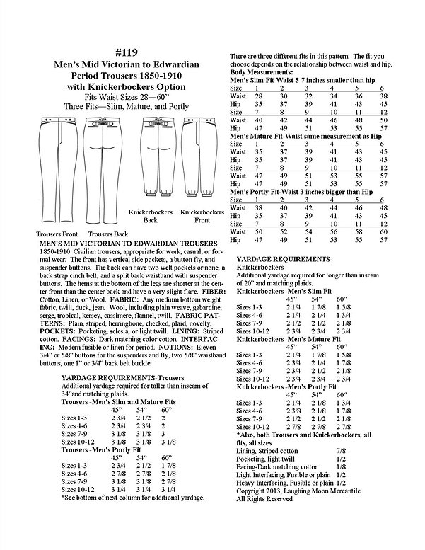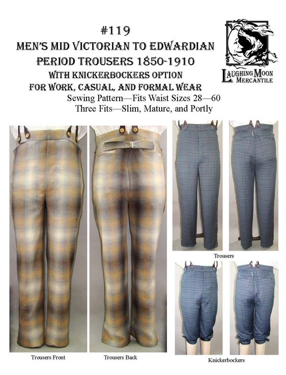 Pattern for men’s mid to late 19th / early 20th century civilian style trousers with horizontal front pockets, button fly and suspender buttons. The back has welt pockets and a cinch belt. This pattern also comes with a knickerbocker option for all sorts of outdoor and sports activities!