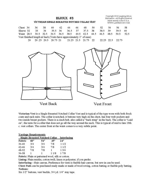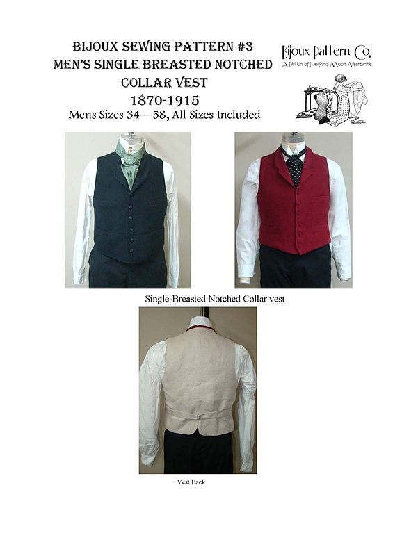 Pattern for a Men’s Victorian Notched Collar Vest 1870-1915. Vest has a notched collar and four welt pockets on the outside and two inside pockets.