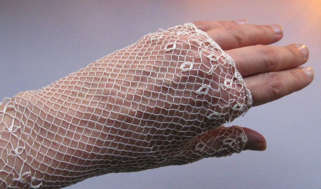 Delicate netted gloves handcrafted from 100% silk reaching above the wrist. They will look dainty with your favorite afternoon dress, a visiting or walking suit and are appropriate for a variety of eras from the 19th – 20th century.