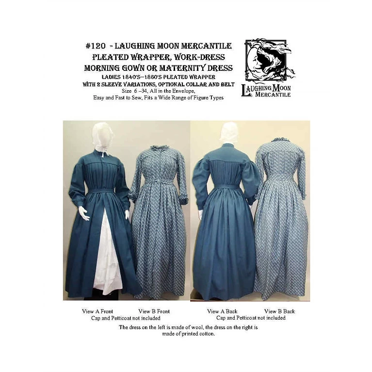 Huge pattern pack for authentic Pleated Wrapper, Work-Dress, Morning Gown or Maternity Dresses 1840s-1860s. This dress was copied from a existing wrapper example dated 1840 in the collection of the author. This style would have been worn from the 1840s to the late 1860s. This type of dress was called different names according it’s purpose. It is a morning dress, or wrapper, meant for informal wear.at home. If it is made with finer more expensive materials it is a gown suitable for a wider range of occasions (as you can also tell from the photos below), including receiving visitors in the home. If it is finished plain, it can also be called a work dress. Worn loose it can be worn for maternity. This dress is perfect for impressions of rural or life on the frontier. It can be made with pleated bishop or pagoda sleeve, with or without standing collar and has a dropped shoulder typical of the time period. It falls freely from the bottoms of the yokes, with no fitted lining underneath. The dress is shown pleated to the yokes but can be gathered instead. View A is a bishop sleeved wrapper with a standing collar. View B has a small pagoda sleeves with a piped jewel neckline. Both views can have the pleats stitched down at the waist or left loose, and the waist can be confined with a belt. Both have piping at the armholes, across the bottom of the yokes, and View B has a piped neckline. The front opening can be left open from top to bottom using closures of buttons or hooks and eyes, or stitched closed from below the waist to the hem, using closures from the neck to the top of the stitching. An optional pocket is included.