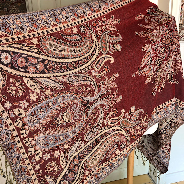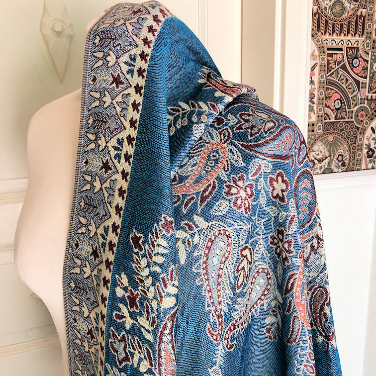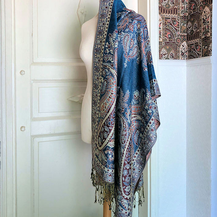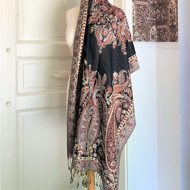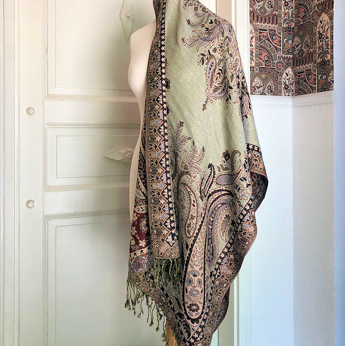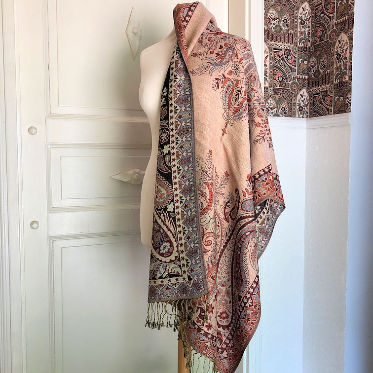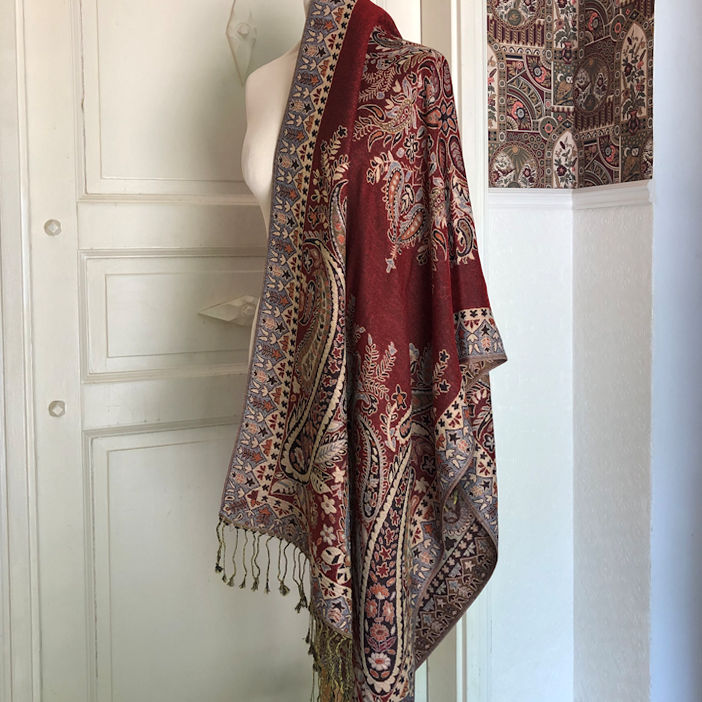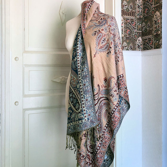 Soft and cozy, this shawl measures ca. 187 cm x 70 cm wide, pashmina (in this case 30% cotton, 70% viscose), lovely paisley motifs in vibrant colours.