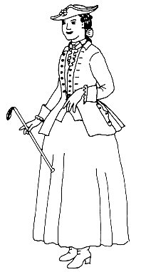 Package includes patterns for a tailored jacket with separate waistcoat and directions for making a matching petticoat. This ensemble is reminiscent of 18th C. men’s fashions and was popular for riding and traveling.