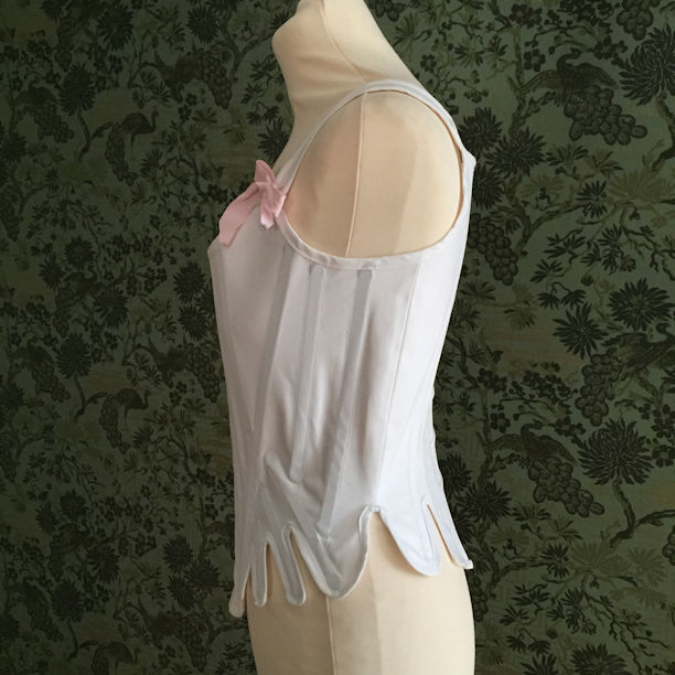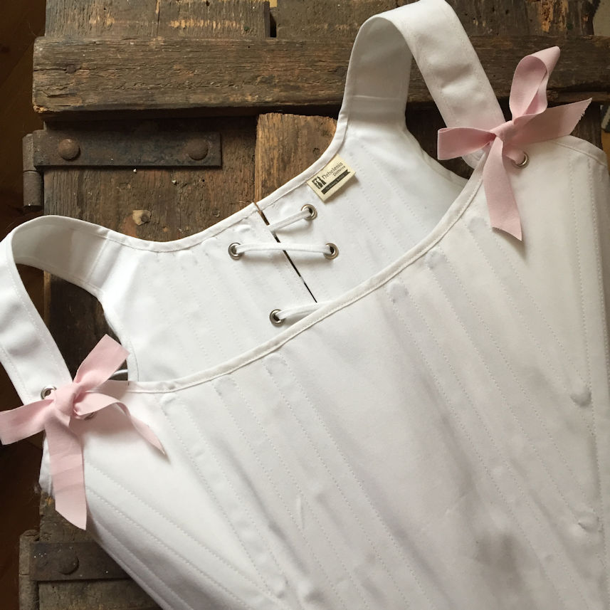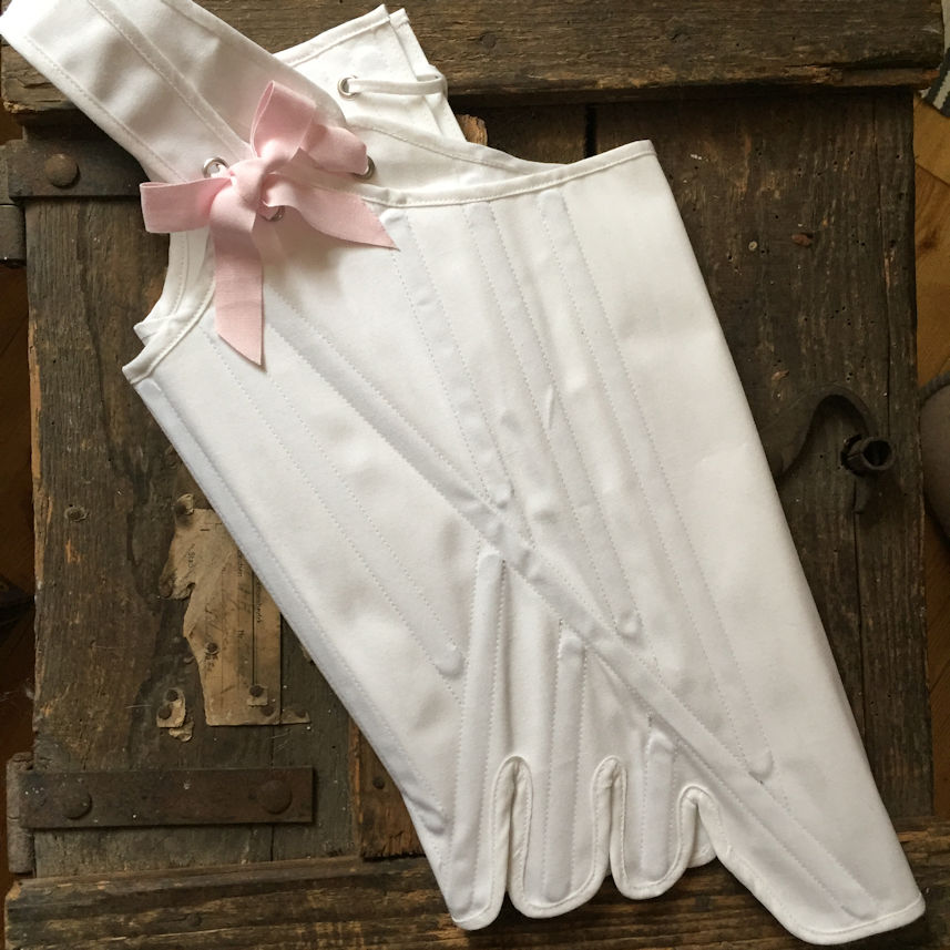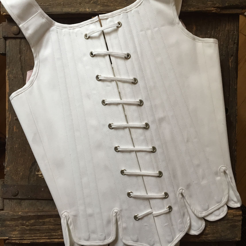 Das Korsett besteht aus zwei Lagen festem Coutil aus 100% Baumwolle und ist mit deutschem Qualitätsstahlband verstärkt. Es wird mittels Korsettschnur aus 100% Baumwolle und gestickten Ösen (oder Metallösen) in historischer Spiralschnürung geschnürt. Lieferbar mit den historischen Schnürvarianten hinten ODER vorne und hinten. Varianten siehe unten! Die Farbe des Bindebandes an den Trägern kann von der Abbildung oben abweichen!