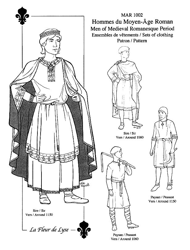Ergibt eine komplette Gaderobe für alle Stände, egal ob Bauer oder Edelmann: Chainse (Unterhemd), Cotte (Tunika), Bliaut (Übertunika), Streifen zum Umwickeln der Hosen, Kappe und Instruktionen zur Anfertigung eines Umhangs