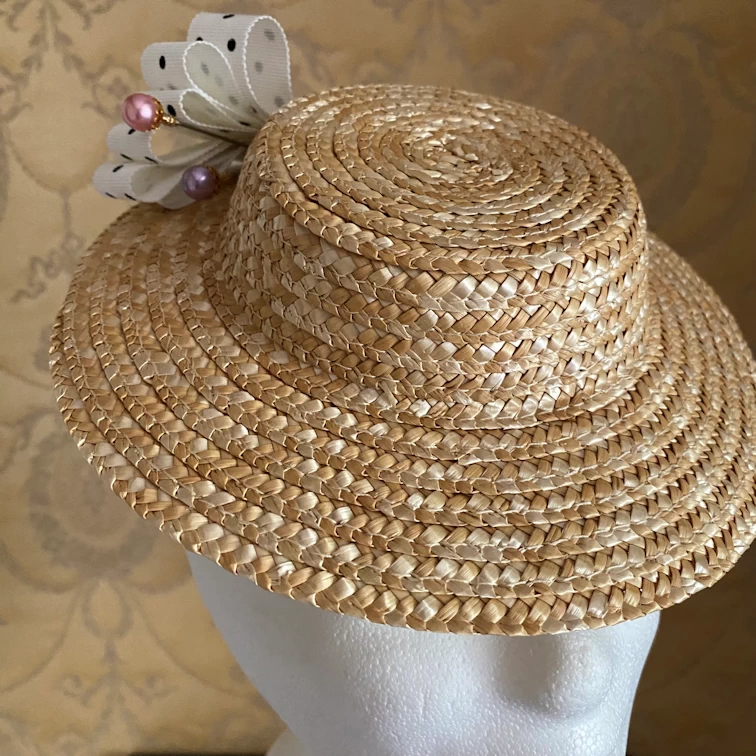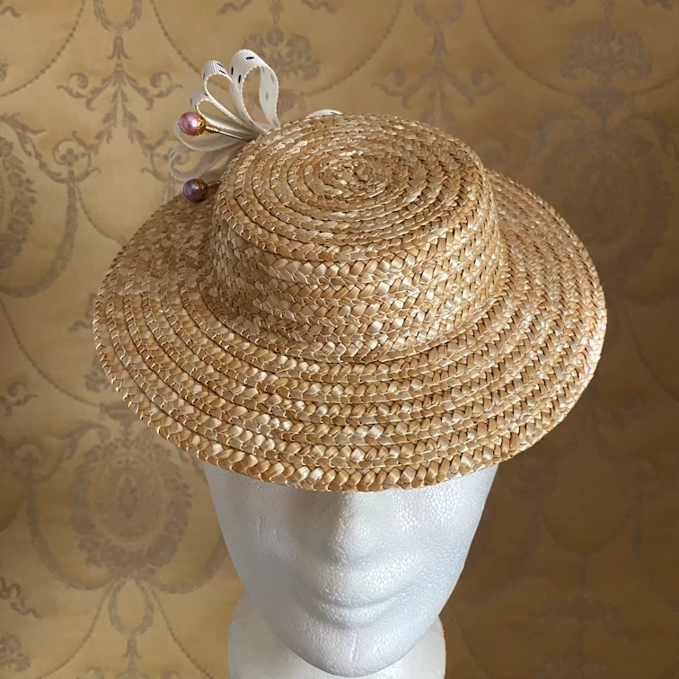 Typical 18th century lady’s straw hat with wide brim and low crown. It has been worn in a variety of sizes and styles. This small style is perfect for a playful look, practical when travelling or just the thing for you if you don’t appreciate the flying tendencies of the large Bergère hats.