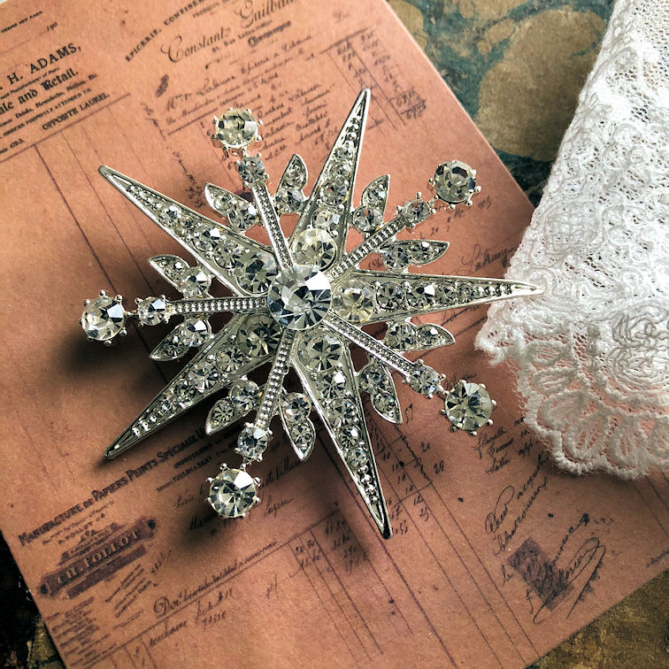 The star motif is frequently found in 18th / 19 th century jewelry. Our brooch “Starburst” is perfectly suitable for 18th C. stomachers, lavish Regency gowns and victorian to edwardian fashions as well. There are also known examples of this design in art deco brooches. Sparkling, facetted crystals are set in a silvertone setting.