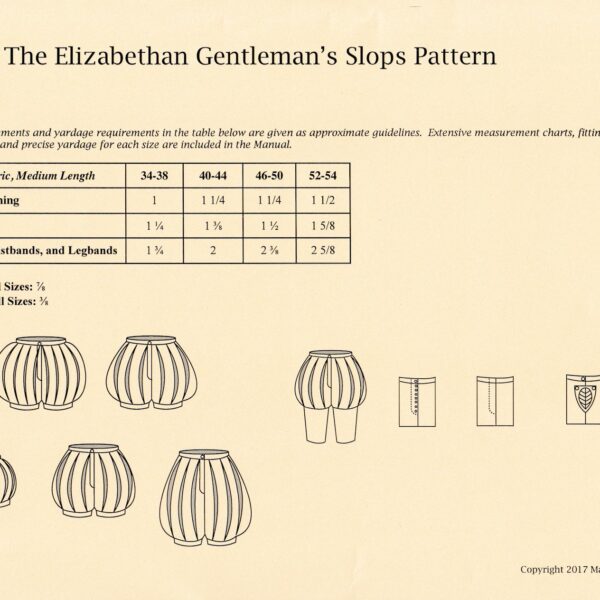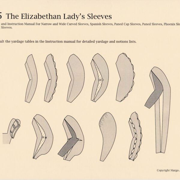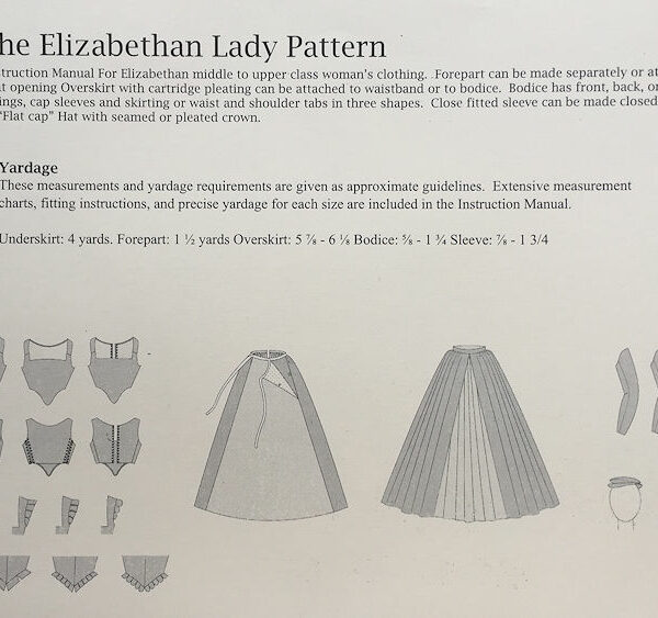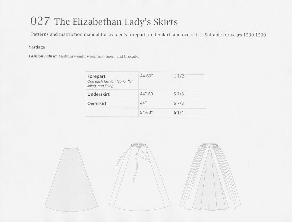 This pattern contains the skirt portions of the basic “core warderobe” for an English woman of the middle to upper class in the years 1560-1590. The styles were also worn , with variations, over most of Europe, and continued to be worn by the less stylish well into the 17th century. The package includes patterns and instructions for an underskirt, a forepart (a often richly decorated panel attached to the front of an underskirt or kirtle), and an overskirt. The skirt can be attached to a matching low necked bodice or doublet, creating a gown, or made up separately with a waistband. The instruction manual includes historical notes, extensive fitting and sewing instructions, and design tips.