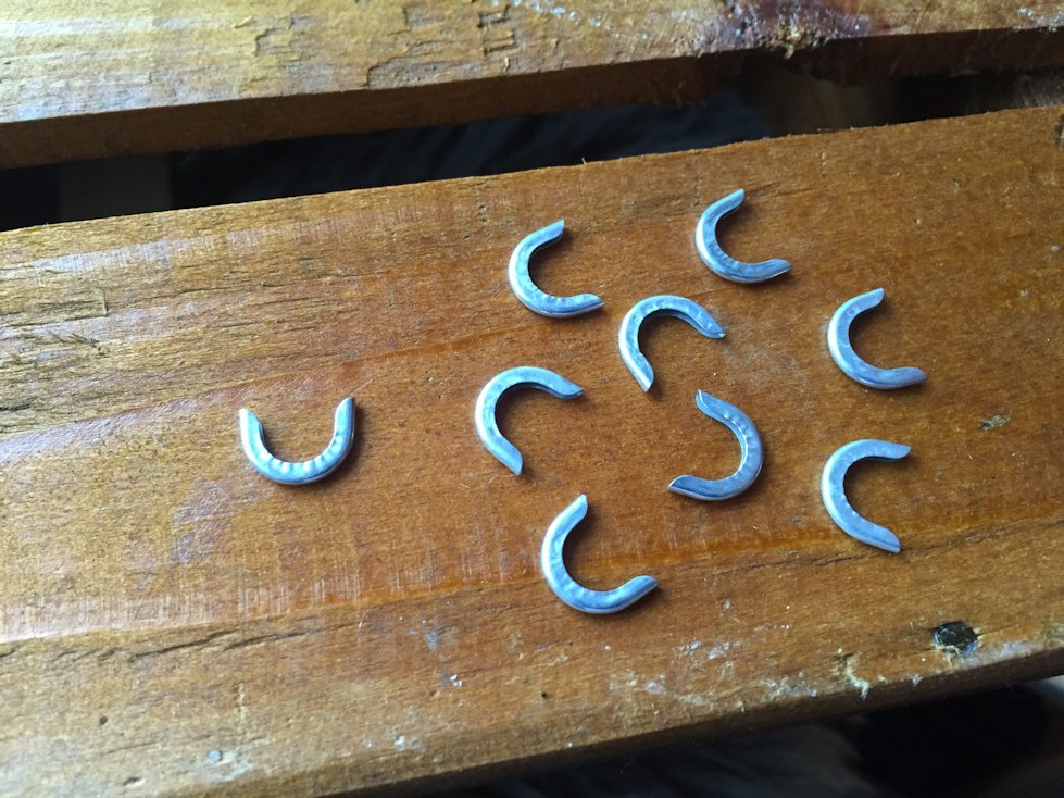 Diese Verschlusskappen aus Metall nehmen dem zugeschnittenen Stahlband die scharfen Kanten, die den Stoff verletzten könnten. Einfach aufstecken und mit einer Zange festdrücken.