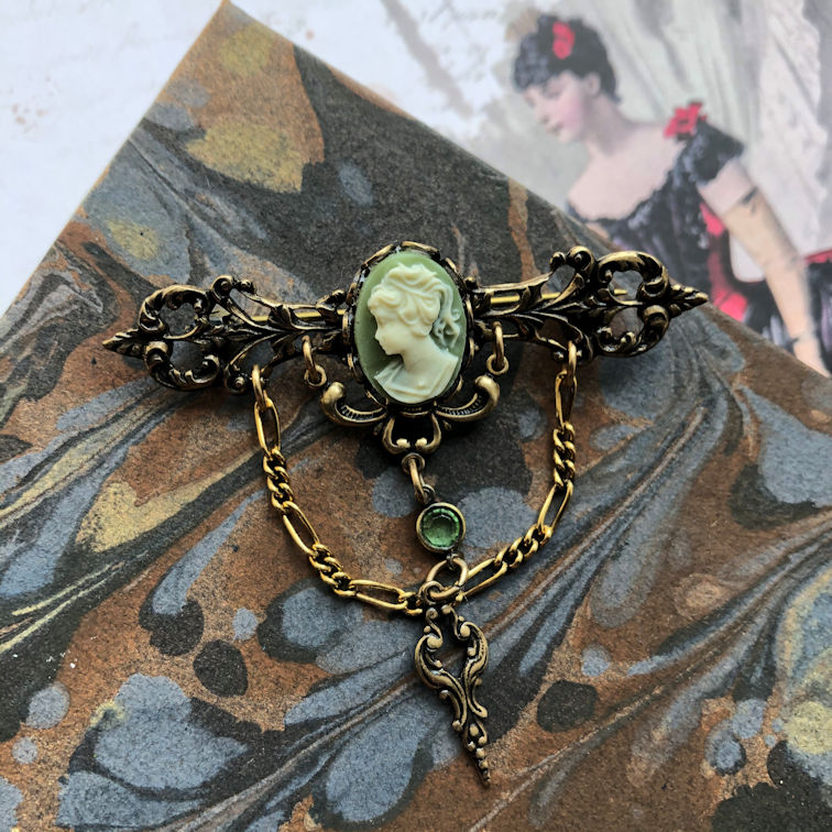 This luxurious brooch features a realistic green cameo set in a lace edged bezel on an antiqued natural brass filigree bar pin. The figaro drop chain is antique gold plated and the decorative drop has an Austrian crystal, too. Looks amazing paired with Victorian high neck blouses!