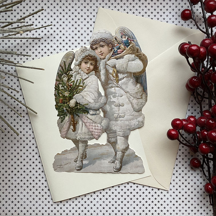Beautiful victorian fold-out christmas card. The snow children motif can be set up with the help of a cardboard stand. A wonderful Christmas decoration for your house, the Advent table or under the Christmas tree. The die-cut motif comes with a blank card and a luxurious envelope for your Christmas mail!
