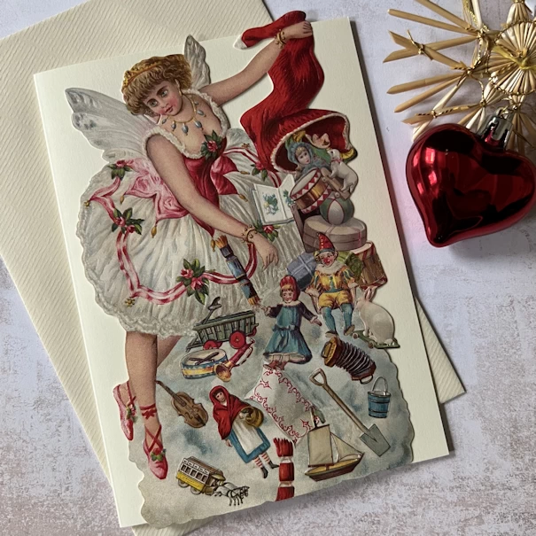Wunderschöne geprägte Aufstellkarte aus Papier. Die fröhliche Weihnachtselfe, die Geschenke aus einem großen Strumpf regnen lässt, kann mittels eines Pappständers aufgestellt werden. Eine herrlich weihnachtliche Dekoration für das ganze Haus, den Adventstisch oder unter dem Tannenbaum. Das ausgestanzte Motiv kommt zusammen mit einer Blankokarte und einem Schmuckumschlag für die Weihnachtspost!