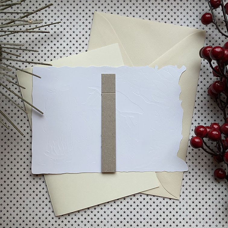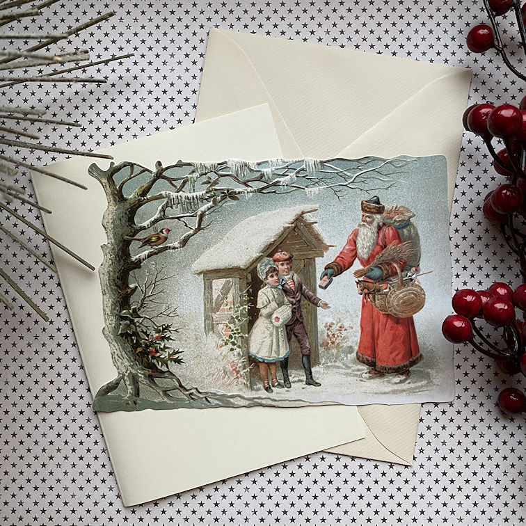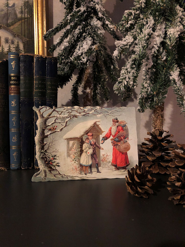 Wunderschöne Aufstellkarte aus Papier. Die ausgestanzte Szene aus der Gründerzeit mit Weihnachtsmann und zwei Kindern in tief verschneiter Landschaft lässt sich mit Hilfe eines Pappständers aufstellen. Eine herrlich weihnachtliche Dekoration für das ganze Haus, den Adventstisch oder unter dem Tannenbaum. Das ausgestanzte Motiv kommt zusammen mit einer Blankokarte und einem Schmuckumschlag für die Weihnachtspost!